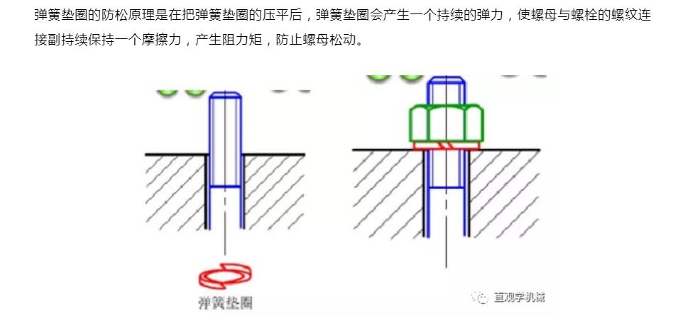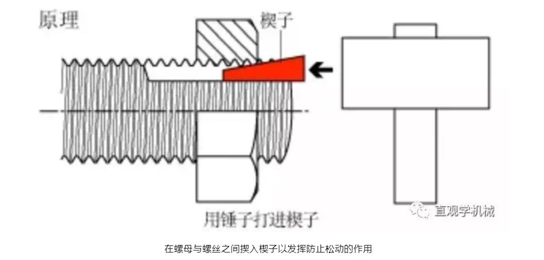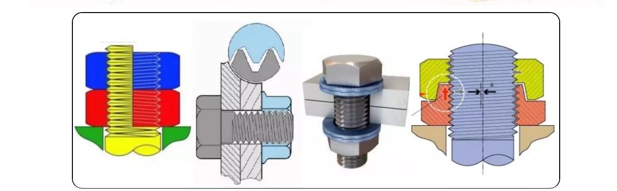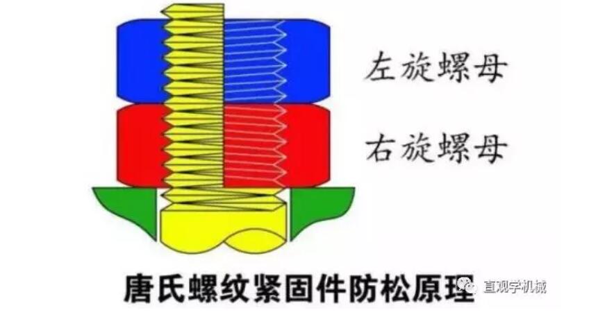 唐氏螺紋防松原理:唐氏螺紋緊固件也是采用雙螺母防松,但是,兩個螺母的旋轉(zhuǎn)方向相反。在沖擊和振動載荷作用時,第一摩摩擦力面的摩擦力會減小和消失,