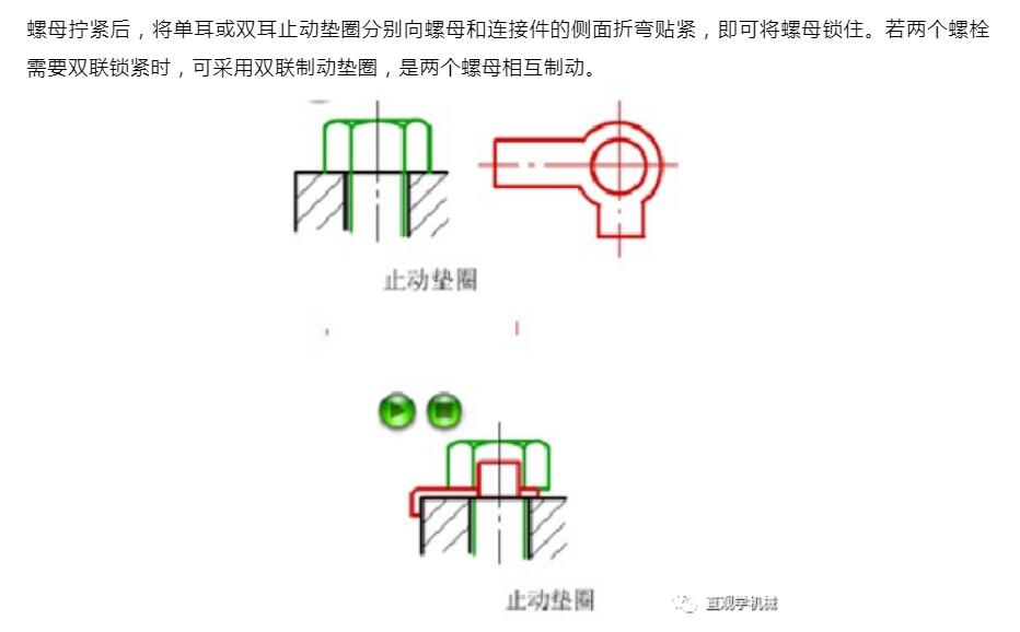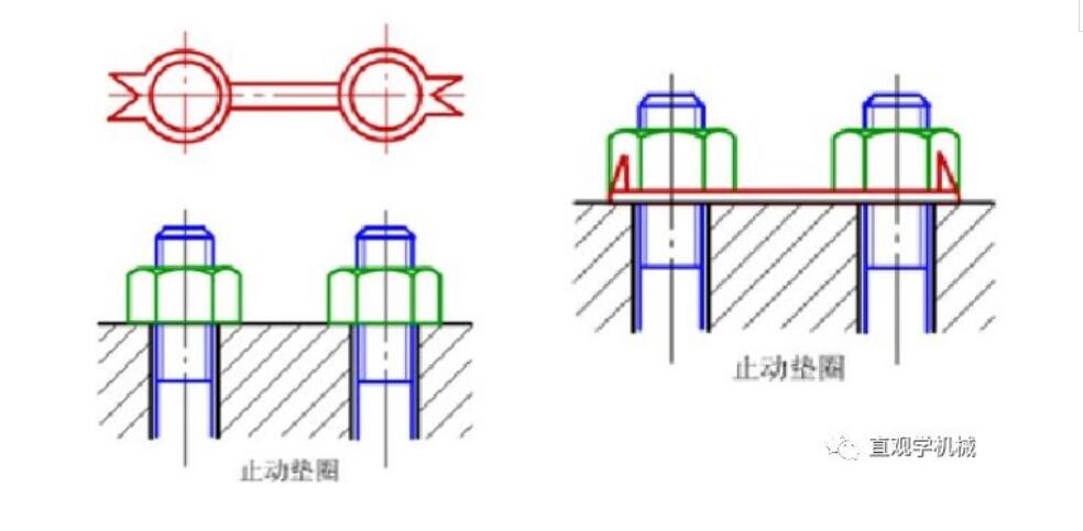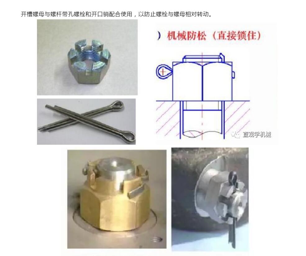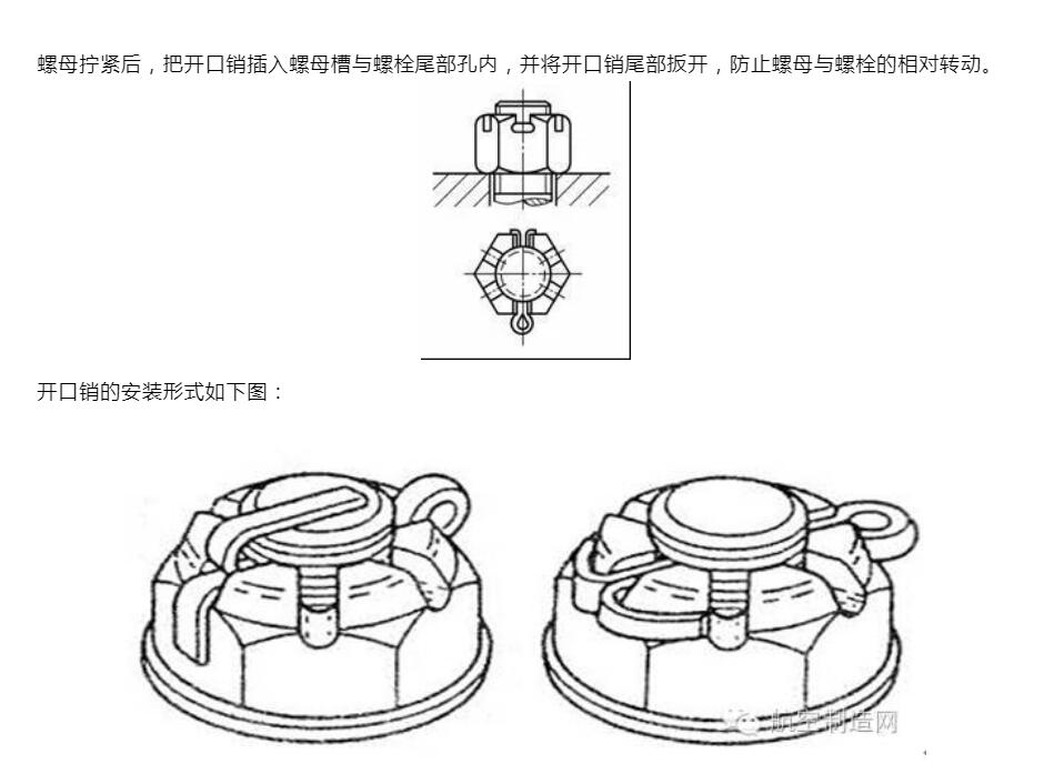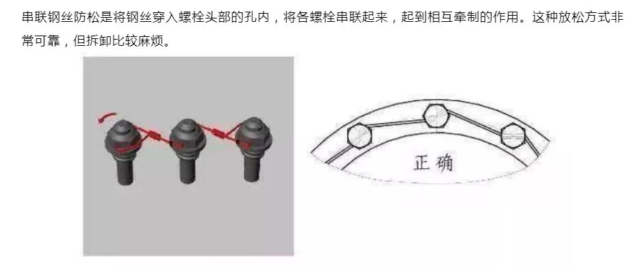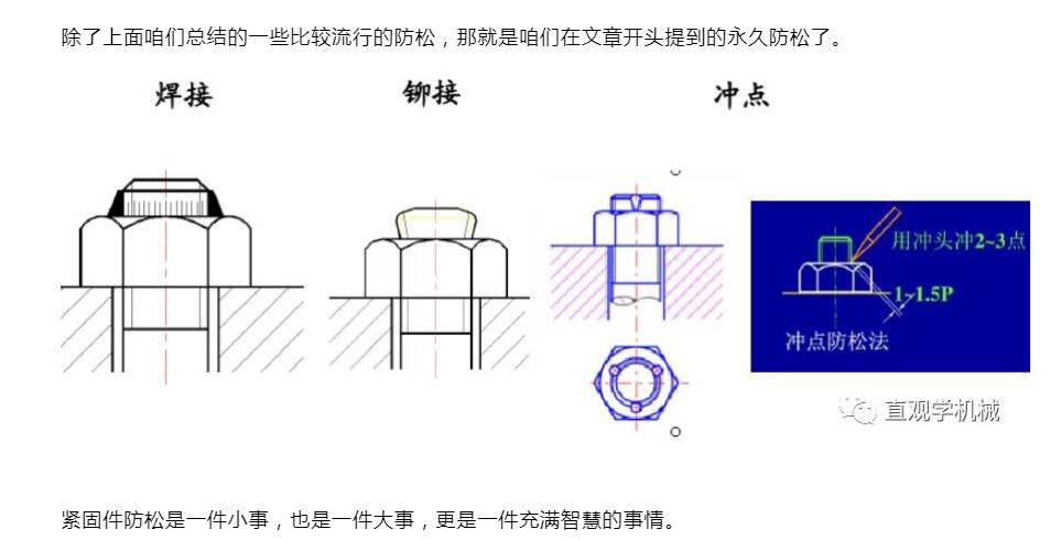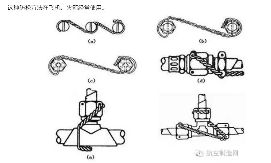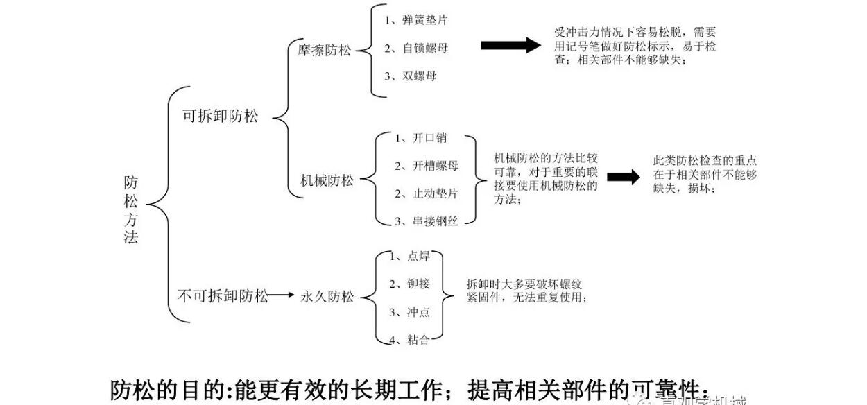 常用的防松方法有三種:摩擦防松、機械防松和永久防松。機械防松和摩擦防松稱為可拆卸防松,而永久防松稱為不可拆卸防松。常用的永久防松有:點焊、鉚接、粘合等,這種方法在拆卸時大多要破壞螺紋緊固件,無法重復(fù)使用。常見摩擦防松有:利用墊片、自鎖螺母及雙螺母等。常見的機械防松方法:利用開口銷、止動墊片及串鋼絲繩等。