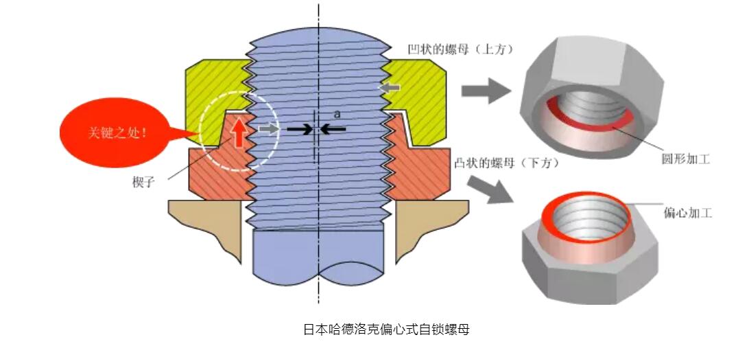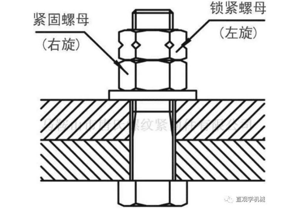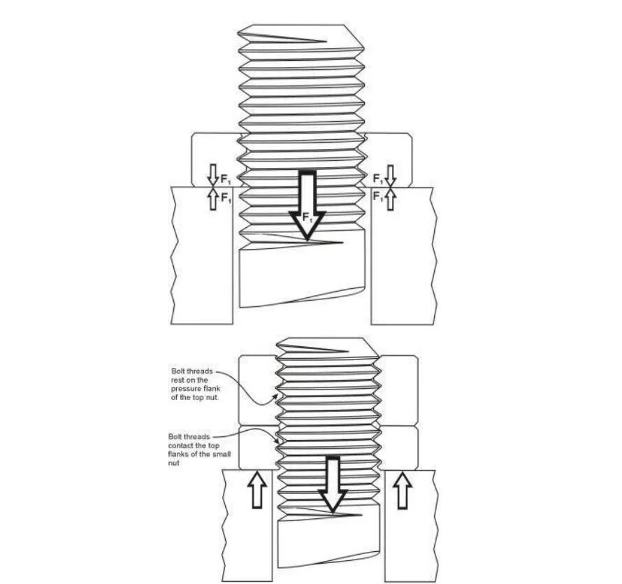 第一螺母(圖中右旋)會產(chǎn)生松退趨勢,即螺母向左旋轉(zhuǎn)。但是第二螺母(圖中左旋)的旋向與第一螺母的旋向相反,因此第一螺母的松退力直接轉(zhuǎn)換成第二螺母的擰緊力。這樣,螺母萬萬不會松退。