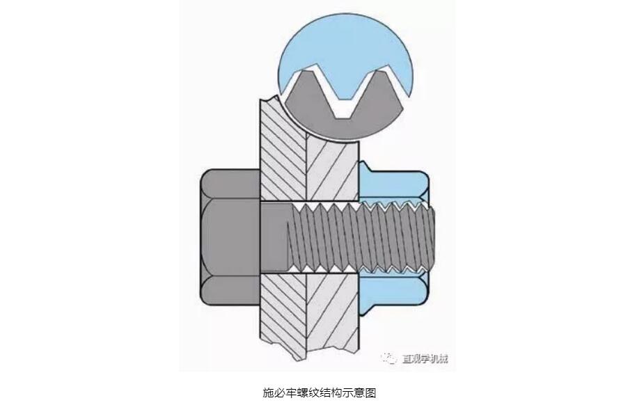 在30°楔形陰螺紋的牙底處有一個30度的楔形斜面,當(dāng)螺栓螺母相互擰緊時,螺栓的牙尖就緊緊地頂在陰螺紋的楔形斜面上,從而產(chǎn)生了很大的鎖緊力。