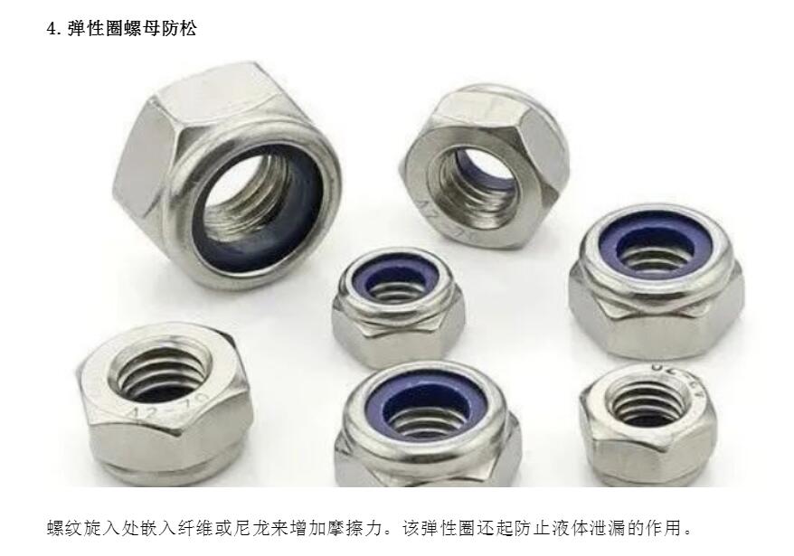 此外還有其他防松方式,如:在旋合螺紋間涂液體膠粘劑、在螺母末端鑲嵌尼龍環、鉚沖防松等。機械防松和摩擦防松稱為可拆卸防松,而永久防松稱為不可拆卸防松。
